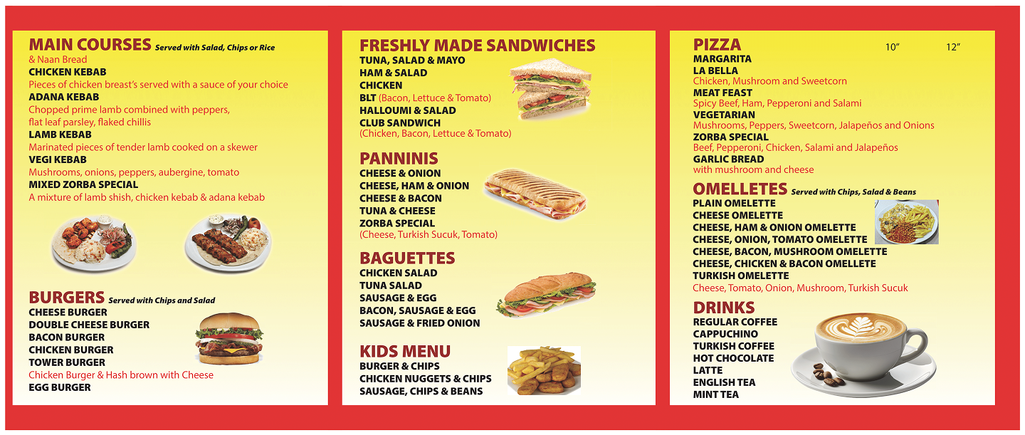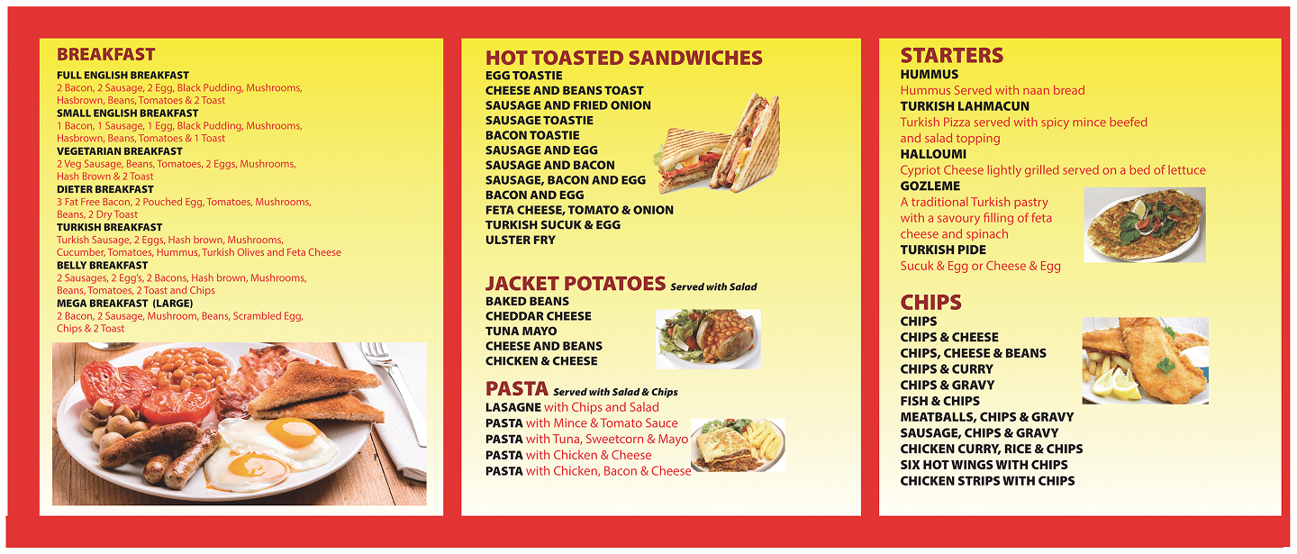 Welcome to our café, where traditional English favourites meet the bold, fresh flavours of Turkish street food. Whether you're in the mood for a hearty Full English breakfast, a crisp and savory gözleme, warm pide, or the rich spices of authentic lahmacun, our menu brings together the best of both worlds. Enjoy comforting classics and vibrant bites, all made fresh and served with a smile.